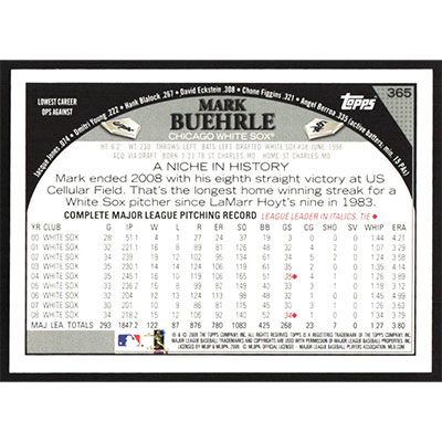 This is a 2009 Topps Mark Buehrle baseball card. The card is #365 and pictures show condition.
