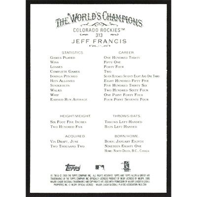 This is a 2009 Topps Allen & Ginter Jeff Francis short print baseball card. The card is #313 and pictures show condition.