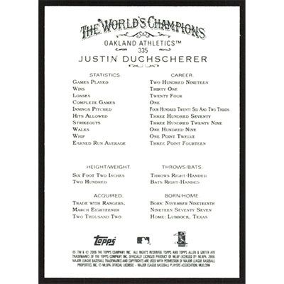 This is a 2009 Topps Allen & Ginter Justin Duchscherer short print baseball card. The card is #335 and pictures show condition. Team(s): Oakland Athletics