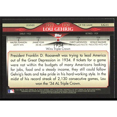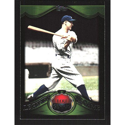 This is a 2009 Topps Legends of the Game Lou Gehrig baseball card. The card is #LG11 and pictures show condition.