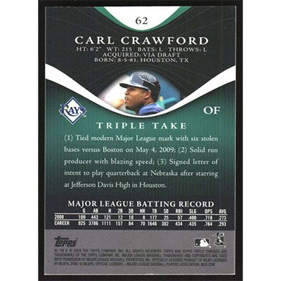 This is a 2009 Topps Triple Threads Emerald Carl Crawford baseball card. The card is #62 and pictures show condition. This card is limited; #'d 022/240.