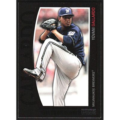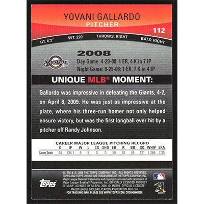 This is a 2009 Topps Unique Yovani Gallardo baseball card. The card is #112 and pictures show condition.