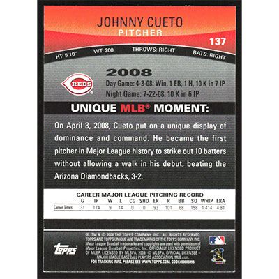 This is a 2009 Topps Unique Johnny Cueto baseball card. The card is #137 and pictures show condition.