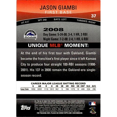 This is a 2009 Topps Unique Jason Giambi baseball card. The card is #37 and pictures show condition.