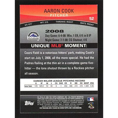 This is a 2009 Topps Unique Aaron Cook baseball card. The card is #52 and pictures show condition.