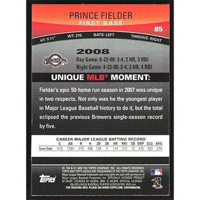 This is a 2009 Topps Unique Prince Fielder baseball card. The card is #85 and pictures show condition.