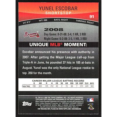 This is a 2009 Topps Unique Yunel Escobar baseball card. The card is #91 and pictures show condition.