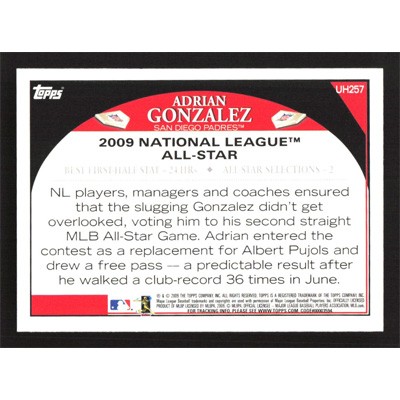 This is a 2009 Topps Update Adrian Gonzalez All-Star baseball card. The card is #UH257 and pictures show condition.