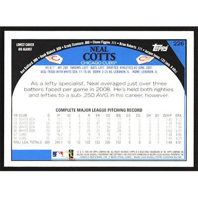 This is a 2009 Topps Wal-Mart Black Neal Cotts baseball card. The card is #226 and pictures show condition.