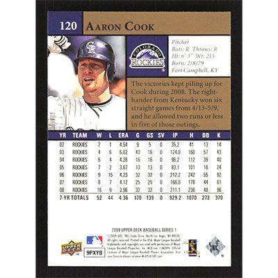 This is a 2009 Upper Deck Aaron Cook baseball card. The card is #120 and pictures show condition.