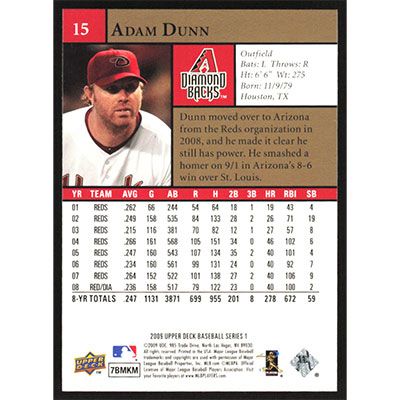 This is a 2009 Upper Deck Adam Dunn baseball card. The card is #15 and pictures show condition.