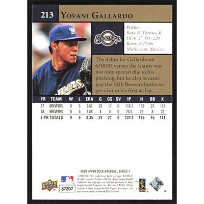 This is a 2009 Upper Deck Yovani Gallardo baseball card. The card is #213 and pictures show condition.