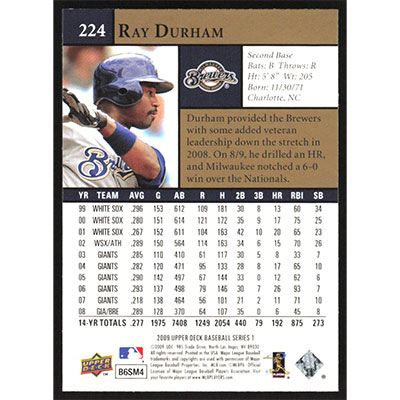 This is a 2009 Upper Deck Ray Durham baseball card. The card is #224 and pictures show condition.