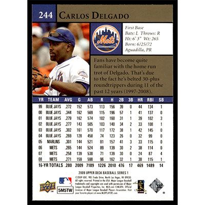 This is a 2009 Upper Deck Carlos Delgado baseball card. The card is #244 and pictures show condition.