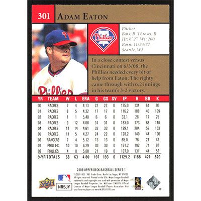 This is a 2009 Upper Deck Adam Eaton baseball card. The card is #301 and pictures show condition.