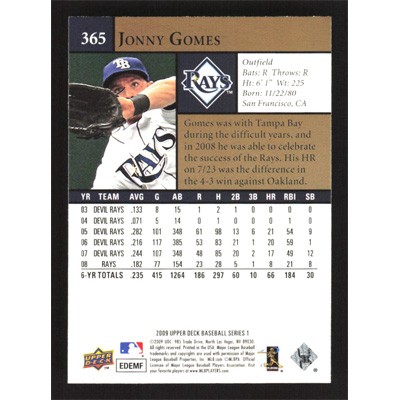 This is a 2009 Upper Deck Jonny Gomes baseball card. The card is #365 and pictures show condition.