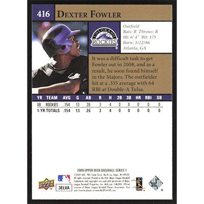 This is a 2009 Upper Deck Dexter Fowler baseball card. The card is #416 and pictures show condition.