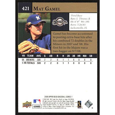 This is a 2009 Upper Deck Mat Gamel baseball card. The card is #421 and pictures show condition.
