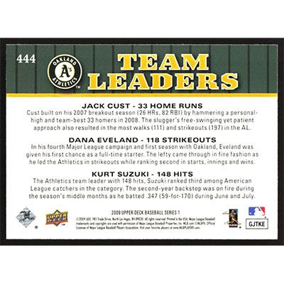 This is a 2009 Upper Deck Jack Cust, Dana Eveland and Kurt Suzuki Team Leaders baseball card. The card is #444 and pictures show condition. Team(s): Oakland Athletics