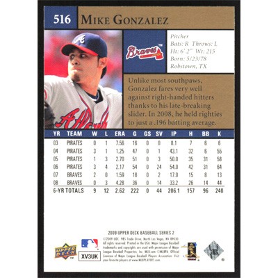 This is a 2009 Upper Deck Mike Gonzalez baseball card. The card is #516 and pictures show condition.