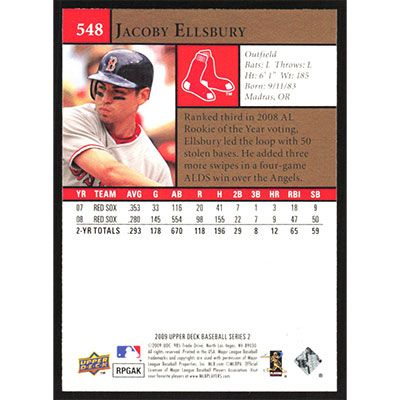 This is a 2009 Upper Deck Jacoby Ellsbury baseball card. The card is #548 and pictures show condition.