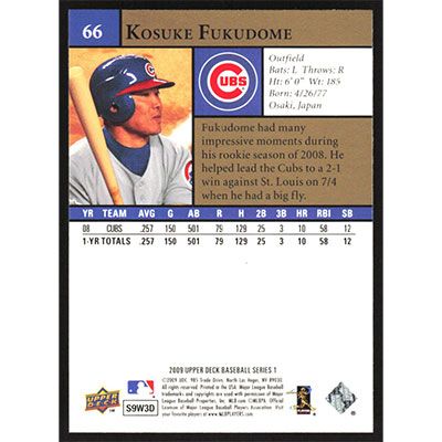 This is a 2009 Upper Deck Kosuke Fukudome baseball card. The card is #66 and pictures show condition.