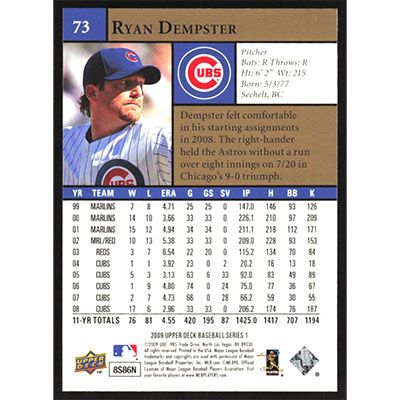 This is a 2009 Upper Deck Ryan Dempster baseball card. The card is #73 and pictures show condition.