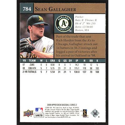 This is a 2009 Upper Deck Sean Gallagher baseball card. The card is #784 and pictures show condition.