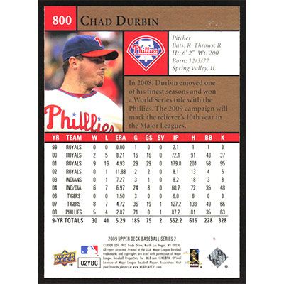 This is a 2009 Upper Deck Chad Durbin baseball card. The card is #800 and pictures show condition.