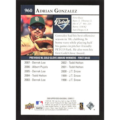 This is a 2009 Upper Deck Adrian Gonzalez Award Winners baseball card. The card is #960 and pictures show condition.