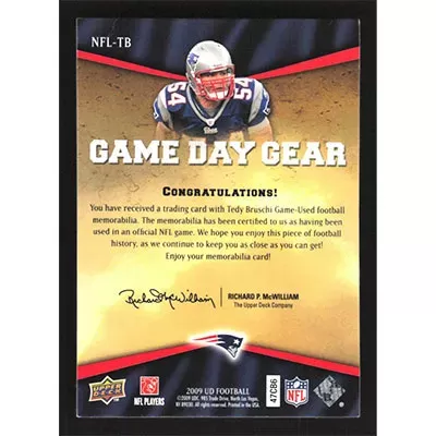 This is a 2009 Upper Deck Game Day Gear Tedy Bruschi Jersey football card. The card is #NFL-TB and pictures show condition.