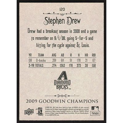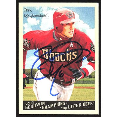 This is a 2009 Upper Deck Goodwin Champions Stephen Drew with Jersey Number autographed baseball card. This card has been signed, in blue, by Stephen Drew, and is guaranteed authentic by Ballcardz.com. The card is #120 and pictures show condition.