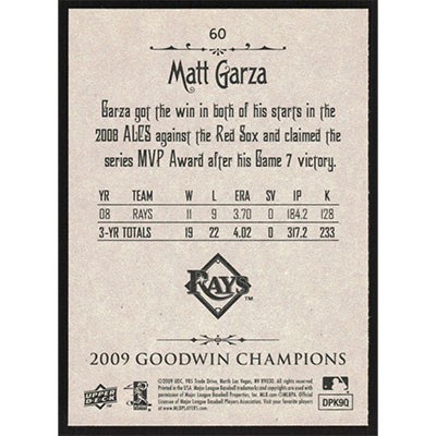 This is a 2009 Upper Deck Goodwin Champions Matt Garza baseball card. The card is #60 and pictures show condition.