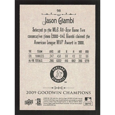 This is a 2009 Upper Deck Goodwin Champions Jason Giambi baseball card. The card is #98 and pictures show condition.