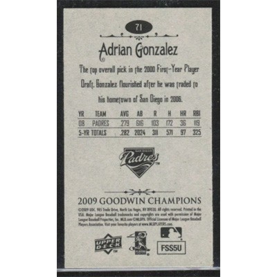 This is a 2009 Upper Deck Goodwin Champions Mini Adrian Gonzalez baseball card. The card is #71 and pictures show condition.