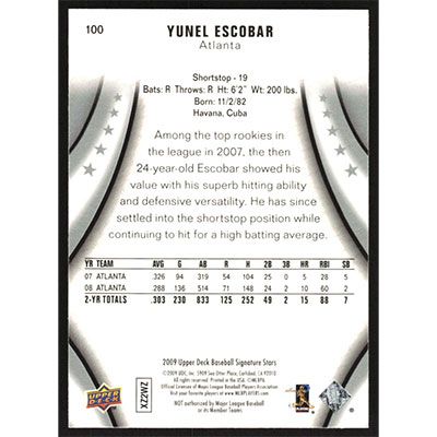 This is a 2009 Upper Deck Signature Stars Yunel Escobar baseball card. The card is #100 and pictures show condition.