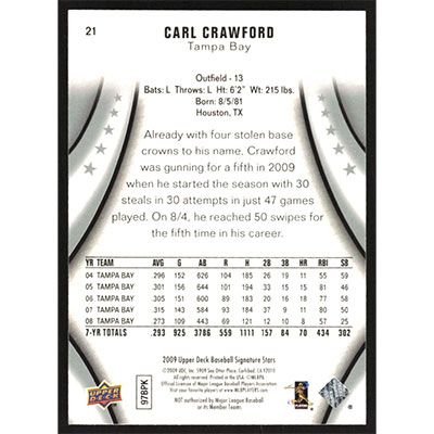 This is a 2009 Upper Deck Signature Stars Carl Crawford baseball card. The card is #21 and pictures show condition.