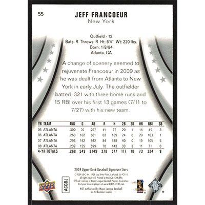 This is a 2009 Upper Deck Signature Stars Jeff Francoeur baseball card. The card is #55 and pictures show condition.
