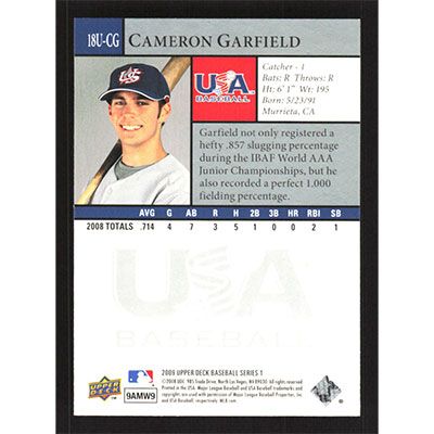 This is a 2009 Upper Deck USA 18U National Team Cameron Garfield baseball card. The card is #18U-CG and pictures show condition.