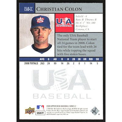 This is a 2009 Upper Deck USA National Team Christian Colon autographed baseball card. This card has been signed, in blue, by Christian Colon, and is guaranteed authentic by Ballcardz.com. The card is #USAB-CC and pictures show condition.