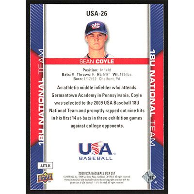 This is a 2009 USA Baseball Sean Coyle autographed baseball card. This card has been signed, in blue, by Sean Coyle, and is guaranteed authentic by Ballcardz.com. The card is #USA-26 and pictures show condition.
