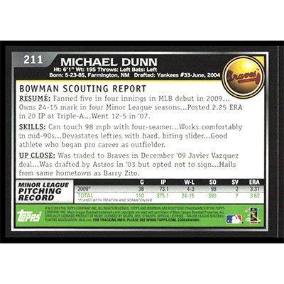 This is a 2010 Bowman Michael Dunn baseball card. The card is #211 and pictures show condition.