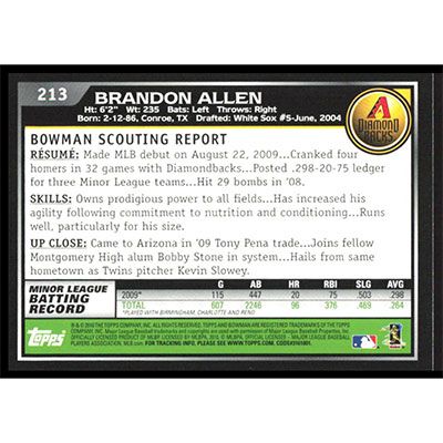 This is a 2010 Bowman Brandon Allen baseball card. The card is #213 and pictures show condition.