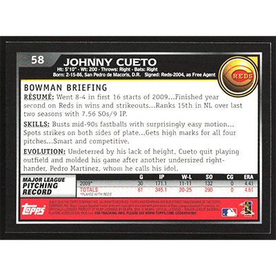 This is a 2010 Bowman Johnny Cueto baseball card. The card is #58 and pictures show condition.