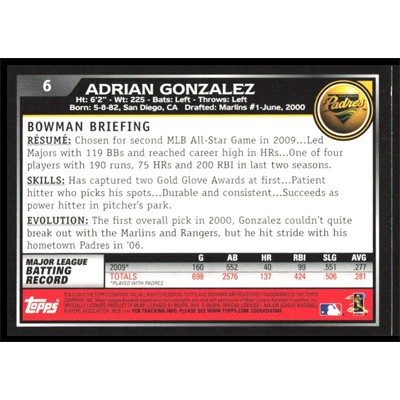 This is a 2010 Bowman Adrian Gonzalez baseball card. The card is #6 and pictures show condition.