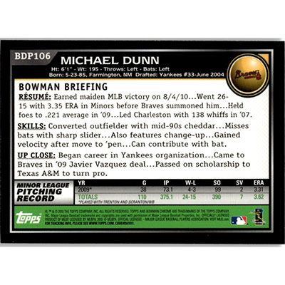 This is a 2010 Bowman Chrome Draft Michael Dunn autographed baseball card. This card has been signed, in blue, by Michael Dunn, and is guaranteed authentic by Ballcardz.com. The card is #BDP106 and pictures show condition.