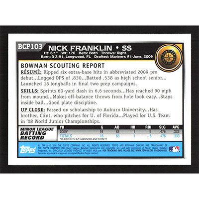This is a 2010 Bowman Chrome Prospects Nick Franklin baseball card. The card is #BCP103 and pictures show condition.