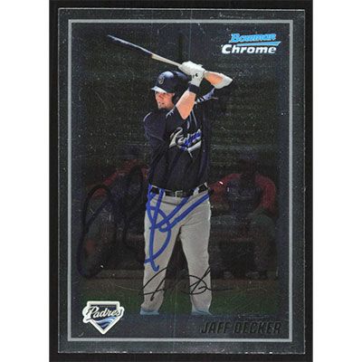 This is a 2010 Bowman Chrome Prospects Jaff Decker autographed baseball card. This card has been signed, in blue, by Jaff Decker, and is guaranteed authentic by Ballcardz.com. The card is #BCP109 and pictures show condition.