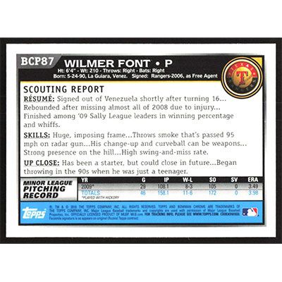 This is a 2010 Bowman Chrome Prospects Wilmer Font baseball card. The card is #BCP87 and pictures show condition.