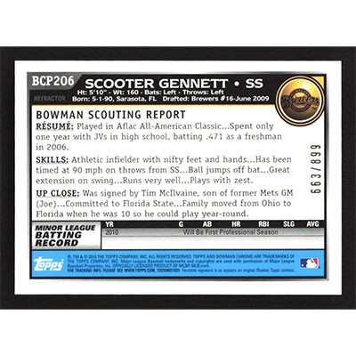 This is a 2010 Bowman Chrome Prospects Purple Refractors Scooter Gennett baseball card. The card is #BCP206 and pictures show condition. This card is limited; #'d 663/899.